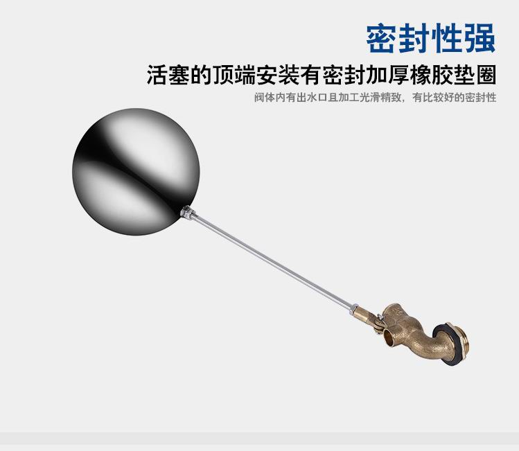當(dāng)水塔內(nèi)水面下降時,浮球下落,利用水管內(nèi)水的壓力,將閥體里的密封硅膠柱塞打開,閥體開啟供水,當(dāng)水塔水位上升時,浮球上浮,連桿帶動柱塞,硅膠體密封進水孔,閥體停止供水.