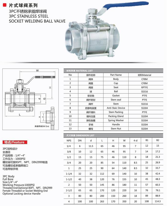 適用介質(zhì):水、油、氣及某些腐蝕性液體(W.O.G) 三片式承插焊球閥適用穩(wěn)定范圍:-20~232℃~350℃三片式承插焊球閥公稱壓力:1.6-6.4MPa